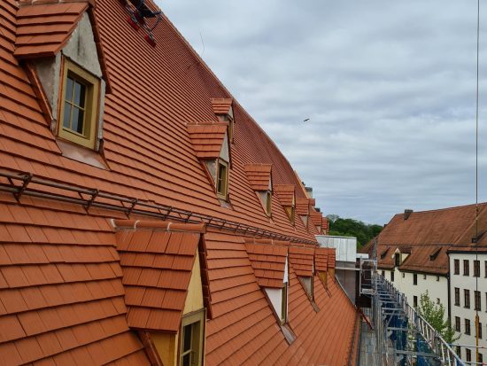 Die Zimmerer können nach Lieferschwierigkeiten bei den Stahlteilen nun endlich weitermachen und die stählerne Bockkonstruktion in den historischen Dachstuhl einbauen.