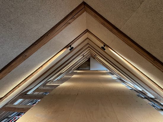 Im Dachspitz wurden bereits die Akustikelemente eingebaut und erste Leuchten installiert. Die anderen Abhangdecken sind in Vorbereitung.