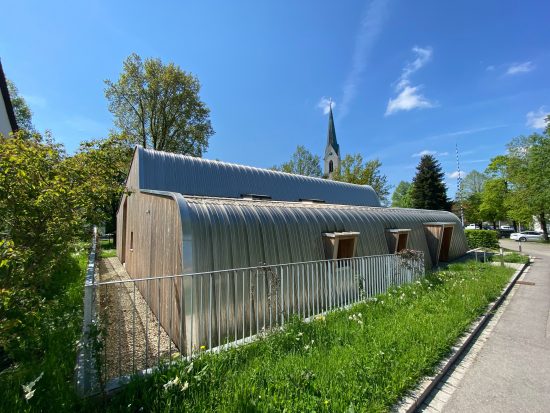 2,5 Jahre nach Fertigstellung, war es an der Zeit dem Pfarrheim in Hohenlinden einen Besuch abzustatten und zu eruieren, ob das Konzept der weitestgehend wartungsfreien Gebäudehülle wieder aufgeht. Und ja, es macht ganz den Anschein! Die Lärchenfassade vergraut dank des fehlenden Dachüberstandes auf der West- und Ostseite sehr homogen und gleichmäßig. Die Südseite hingegen mit seinem großzügigen Dachüberstand über der Terrasse, weißt nach wie vor den warmen, honigfarbenen Ton des heimischen Lärchenholzes auf und trägt das warmtonige, wohnlichen Ambiente des Innenraums so in den Aussenbereich. Die Nordseite ist durch die damals durchaus kontrovers aufgenommene Entwurfsentscheidung, dass Blechdach bis auf den Sockel herunterzuziehen – ohnehin sehr wartungsarm und pflegeleicht – lediglich Laub und Äste müssen regelmäßig aus den Entwässerungsrinnen im Boden entfernt werden. Auch der naturnah gestaltete Vorbereich mit Blühwiese und heimischen Blühsträuchern trägt zum Konzept des unterhaltsfreundlichen Gebäudes bei – die Bienen freut es zudem.