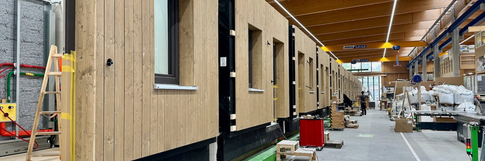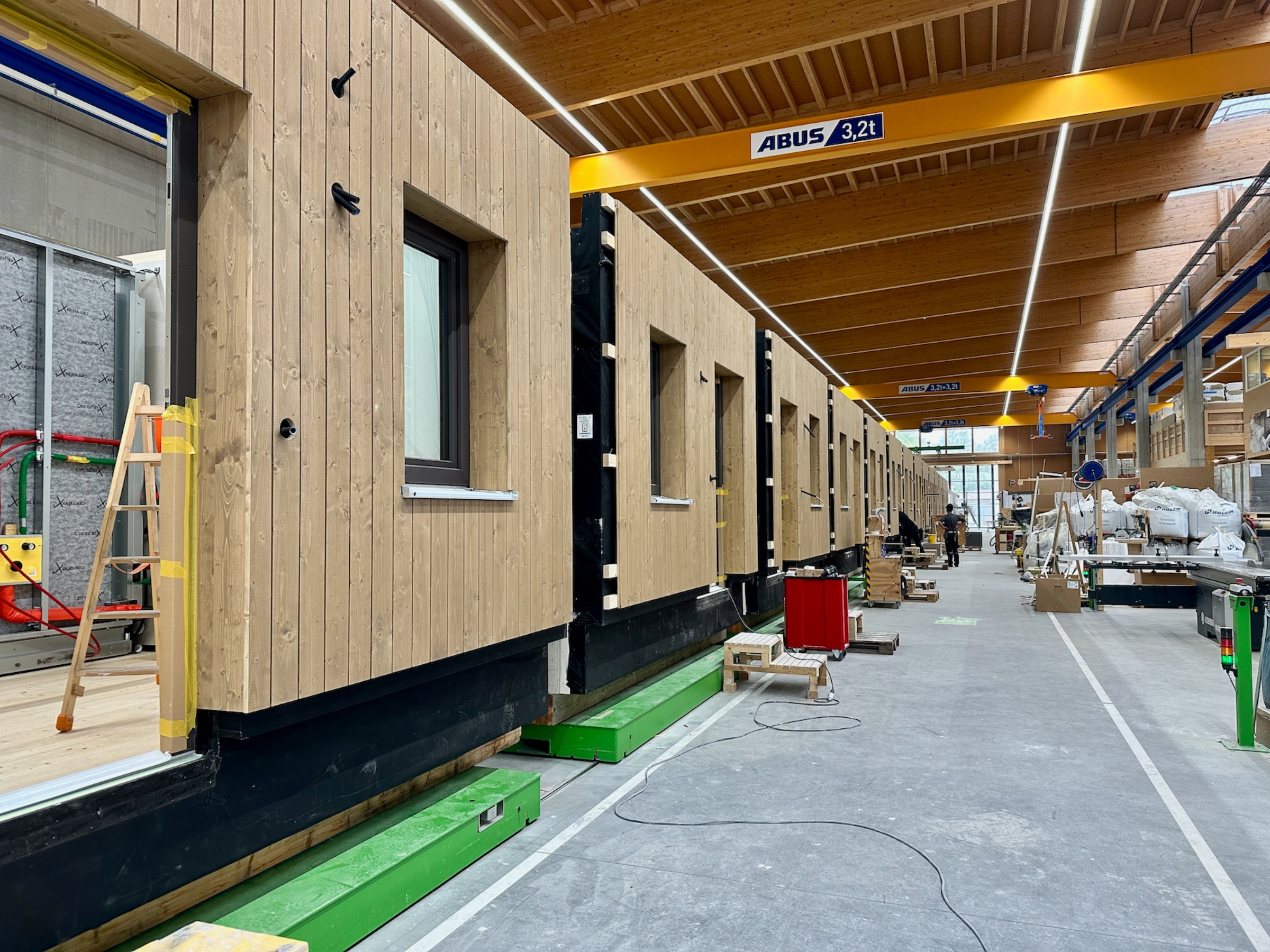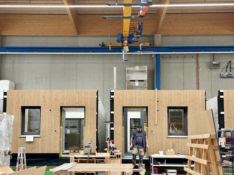 Kürzlich durften wir Timber Homes in Dorfen besuchen und einen Blick in die Fertigung der Holzraummodule für unser Projekt in Ising werfen. Wir erhielten einen umfassenden Einblick in die verschiedenen Produktionsschritte. Für uns, die wir intensiv an der Planung der Module arbeiten, war es besonders interessant, die einzelnen Fertigungszustände zu sehen – vom „Rohbau“-Modul, nur bestehend aus Wänden und Boden bis hin zum nahezu fertigen Wohnraum mit kompletter Möblierung. Die Vorteile der industriellen Fertigung wurden uns aufs Neue bewusst – die guten Arbeitsbedingungen haben ein qualitativ hochwertiges Ergebnis zur Folge. Wir erwarten mit Spannung den nächsten Arbeitsschritt – die Montage der Module vor Ort.